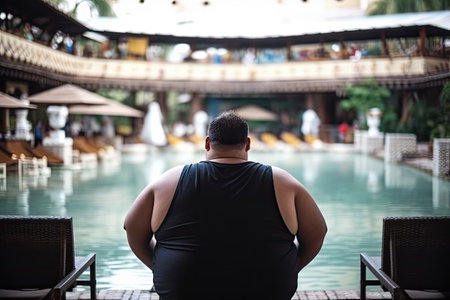 Back view of fat man with overweight standing near swimming pool at hotel resort. Problem of obesity during summer holidays. Created with Generative AI