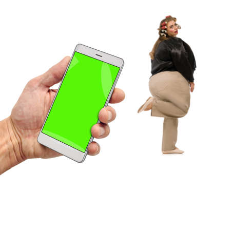 Male photographer hand holding smartphone with green chroma key screen, funny overweight fat woman posing