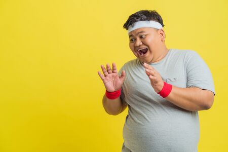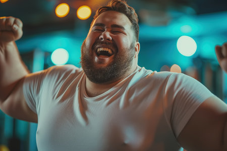 Happy overweight man with a beard in a white T-shirt is actively engaged in weight loss training. Fat aerobics winner.