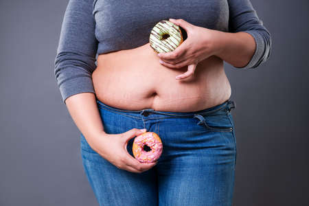 Fat woman posing with donuts on a gray background, fast food and unhealthy nutrition concept