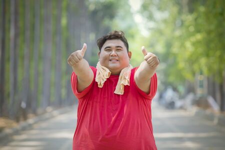 Close up of young fat man smiling at the camera while wearing sportswear in the park at autumn time