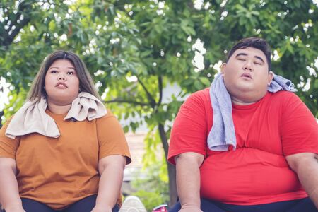 Portrait of fat Asian couple wearing sportswear, while taking a break after working out at the park