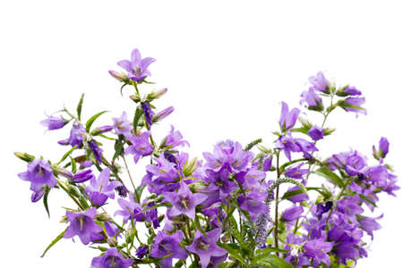 close-up of Campanula or bellflower on white background with copy space. floral macro. spring and summer border template . greeting and holiday card or postcard