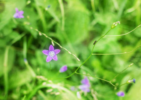 Flower Blue campanula on the edge of the forest. Beautiful wild flower closeup with copy space