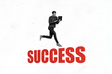 Collage 3d image of pinup pop retro sketch of running young man businessman netbook success bizarre unusual fantasy billboard
