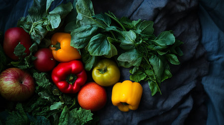 Composition with variety of raw organic vegetables and fruits. Balanced diet