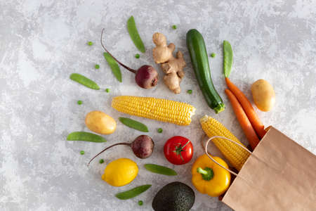 Paper bag and various vegetables, healthy food on a gray background. Flat lay. Food purchase and delivery. Copy space.