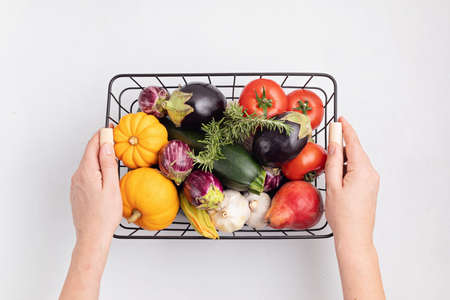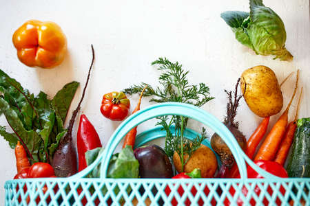 flat lay basket organic vegetables with copy space. High quality beautiful photo concept