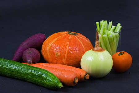 Set of vegetables Fresh mix delicious ingredients healthy for cooking or salad making on black background, concept of healthy eating.