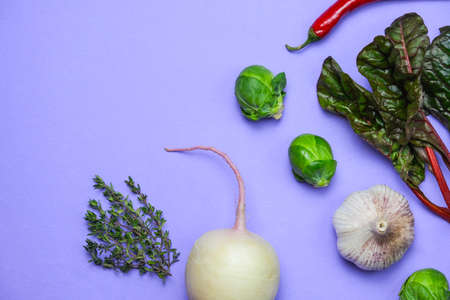 creative layout. Food background from a set of vegetables with radish, radish, maltese cabbage, garlic, beetroot, batwa, pepper and thyme on a trendy purple background. flat lay. Correct nutritional concept.