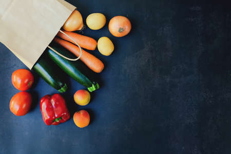 Shopping or delivery healthy food concept. Food supermarket and clean vegan eating concept. Fresh vegetables and fruits: carrot, potato, zucchini, tomato in paper bag on black background. Copy space.