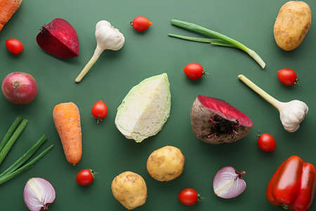 Set of vegetables, potatoes, carrots, onions, garlic, pepper, beets for cooking borscht on a textured background.