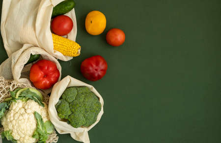 Vegetables in eco bag on green surface with a copy space. Pepper, tomato, corn, cucumber, broccoli, cauliflower in reusable shopping eco friendly cotton fabric bags. Zero waste plastic free concept.