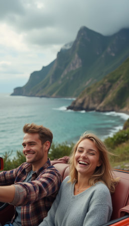 Couple driving in a convertible on a coastal road, enjoying the ocean breeze