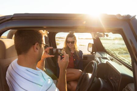 Side high angle view of a Caucasian man with his girlfriend smiling inside an open top car, taking a photo of her