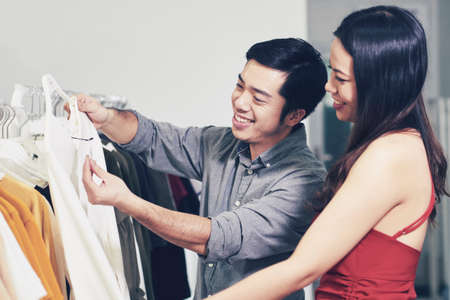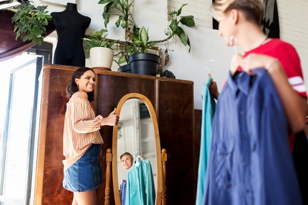 Young attractive woman showing striped tops to female friend while standing in clothing store at shopping mall