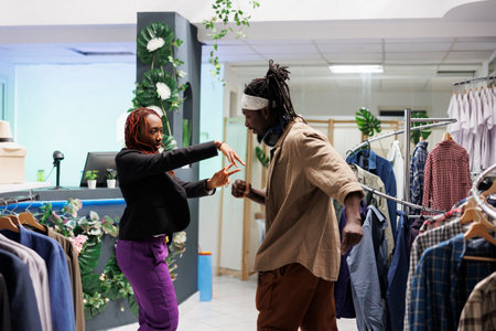 Young female friends having fun while shopping in clothing store. Pretty girl using her shoes to show funny bunny ears