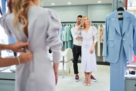 A beautiful girl in a dress and an attractive man in a suit are engaged in shopping. They are in a light showroom. The girl shows clothes to her man. The man is angered by the girl's behavior.