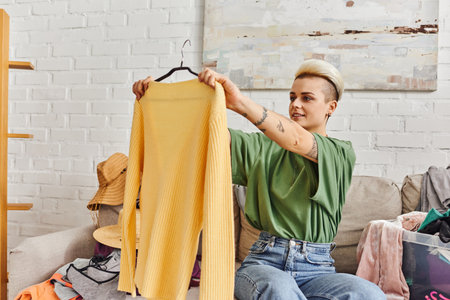 young tattooed woman smiling and looking at yellow trendy jumper while sitting on couch near thrift store finds in modern living room at home, sustainable living and mindful consumerism concept