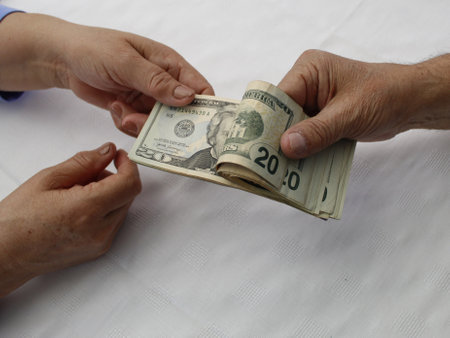 Two men are exchanging money. One man is holding a $20 bill. The other man is holding a $5 bill