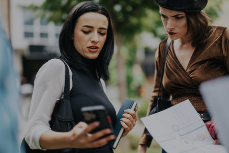 Two people sitting closely together discussing details of an art exhibition pamphlet, with additional background figures visible. Casual yet focused atmosphere shared by individuals
