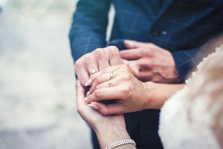 bride holding groom hand, couple's hands with wedding rings. Sign, symbol of family concept