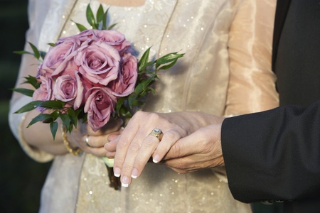 Detail of the hands of the bride and groom, the wedding rings and the passage of the wedding rings
