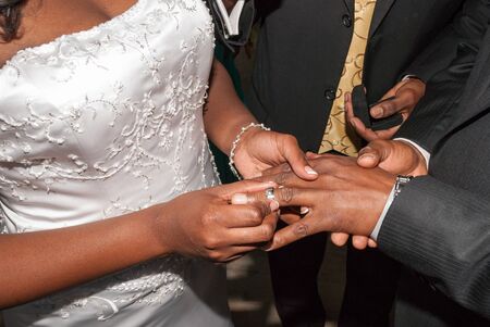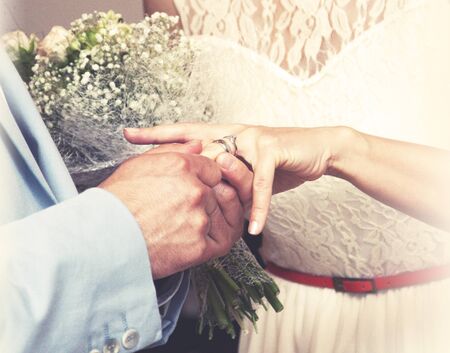 The groom or husband puts the ring on the bride or wife of the wedding ceremony. Wedding event.