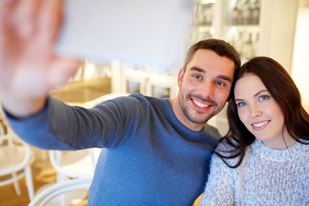 people, technology and dating concept - happy couple taking smartphone selfie at cafe or restaurant
