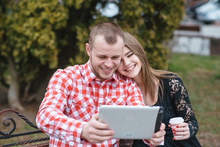 beautiful couple in a cafe at a table drinks coffee and watching something on her phone