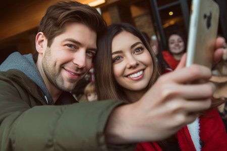 A man and woman are posing for a picture with a cell phone. The man is holding the phone up to his face, while the woman is smiling. Concept of happiness and togetherness