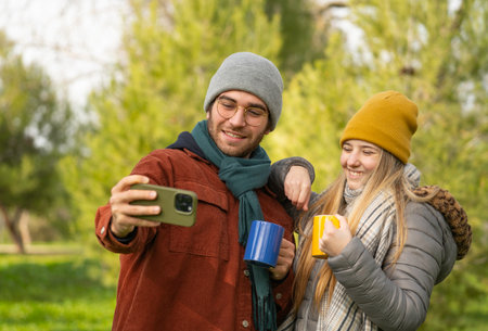 Young couple smiling and taking a selfie with a smartphone while holding mugs in a park during winter