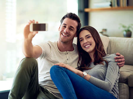 Happy at home with my love. Shot of a happy young couple taking selfies together at home.