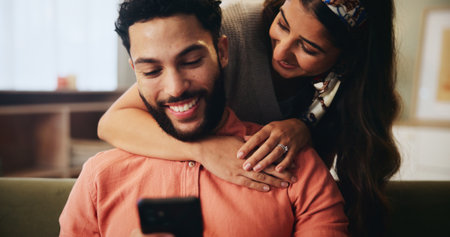 Hug, happy and couple on sofa with phone for bonding, loving relationship and relax together in home. Love, apartment and man with woman embrace on smartphone for social media, website and internet
