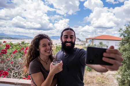 Couple of blonde curly hair woman and long black hair and beard man taking a selfie on a terrace with the town in the background