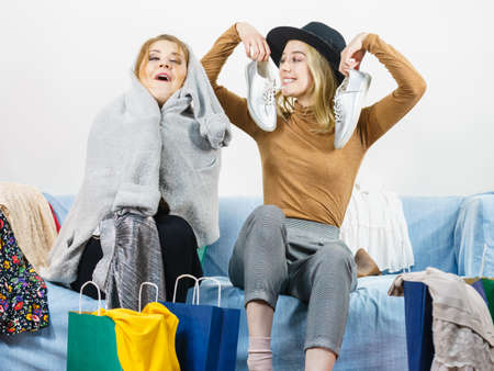 Two happy joyful women having fun after shopping, picking outfit in closet. Female friends fooling around.