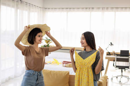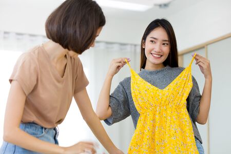 Two young Asian women are choosing clothes for traveling in the summer holidays. Pretty girls planning a vacation trip.