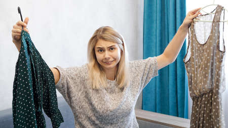 Cute woman choosing her outfit, holding two dresses on hangers. She is confused and does not know what to choose