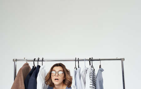 beautiful woman with glasses stands near clothes wardrobe suits Model