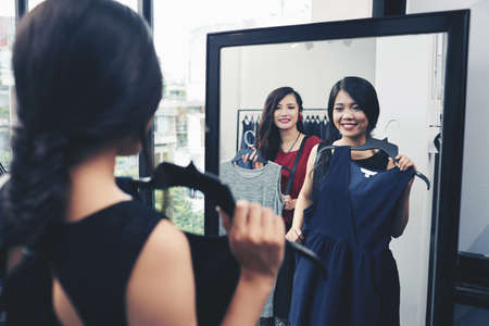 Smiling Asian girl trying on dress in front of mirror