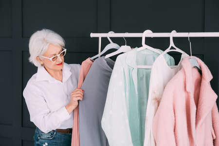 Senior fashion style. Shopping and clothing options. Elderly lady choosing outfit.