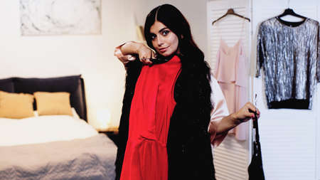 Young cheerful women holding two colorful bright dresses and choosing what to wear. Happy girls getting ready for special event or date and picking apparel in her bedroom from clothes on the rack