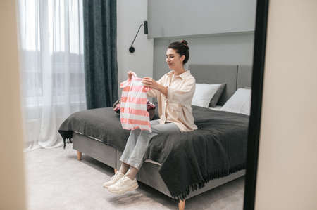 Wear, clothing shop during sales, summer or autumn collection. Young woman trying cloth, looking for new attire. Concept of fashion, style, offers, emotions, sales, purchases. Brand new shopping.