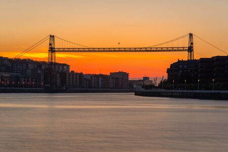 Hanging Bridge of Bizkaia at sunset from La Benedicta pier, Basque Country, Spain
