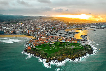 Drone point of view Gijon or Xixon city in north-western Spain during sunset, coast of Cantabrian Se, Bay of Biscay, in the central-northern part of Asturias. Travel destinations, landmarks concept
