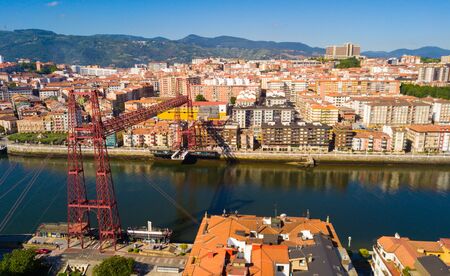 Aerial view of Vizcaya bridge over the river and cityscape at Portugalete, Spain