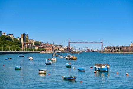GETXO, SPAIN - JULY 7, 2021: View from Getxo, Spain: the famous Vizcaya Bridge built in 1893, declared a World Heritage Site by UNESCO and the town of Portugalete in the background
