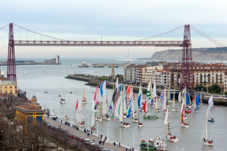 PORTUGALETE, SPAIN - DECEMBER 21, 2013: Championship of sailboats under the hanging bridge in Portugalete.