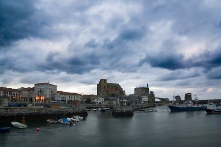 Comillas Monumental View Under Dramatic Sky - Monument and village of Comillas, Cantabria, Spain, featuring green hills and historic architecture under a cloudy, atmospheric sky.