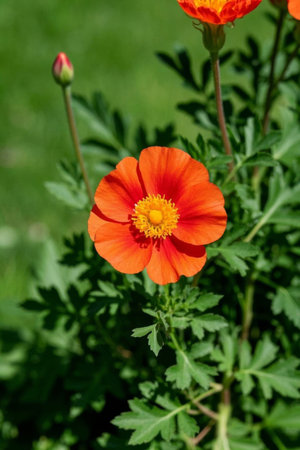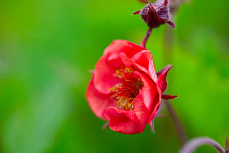 Geum coccineum in the spring garden. Red blooming flowers Geum aleppicum on a green background. Close up.